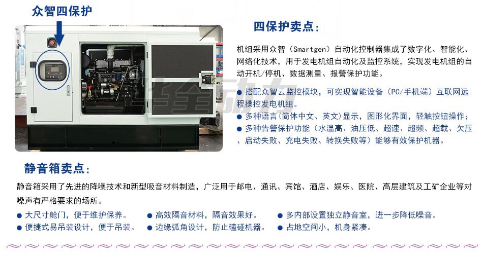 機(jī)組采用眾智(Smartgen)自動(dòng)化控制器集成了數(shù)字化、智能化、網(wǎng)絡(luò)化技術(shù),用于發(fā)電機(jī)組自動(dòng)化及監(jiān)控系統(tǒng),實(shí)現(xiàn)發(fā)電機(jī)組的自動(dòng)開(kāi)機(jī)/停機(jī)、數(shù)據(jù)測(cè)量、報(bào)警保護(hù)功能。
