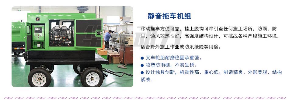 移動(dòng)拖車(chē)方便可靠,掛上脫鉤可牽引至任何施工場(chǎng)所,防雨,防塵,通風(fēng)散熱性好,高強(qiáng)度結(jié)構(gòu)設(shè)計(jì),可挑戰(zhàn)各種嚴(yán)峻施工環(huán)境,適合野外施工作業(yè)或防汛搶險(xiǎn)等用途。